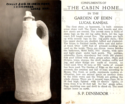 Anyone who has studied American Folk / Outsider art environments is familiar with Steven Dinsmoor and his Garden of Eden. This appears to be a less common period image. Apparently, Dinsmoor kept this handmade object at the foot of the concrete coffin he made...in case he had to grab some water. That is if he was going down instead of up. It's hot down there. See HERE and elsewhere for more pictures. Let me know if you find a picture of the jug in place? You might also enjoy the book / ebook In Situ: American Folk Art in Place by Jim Lindeman. Available for purchase HERE on Blurb.
